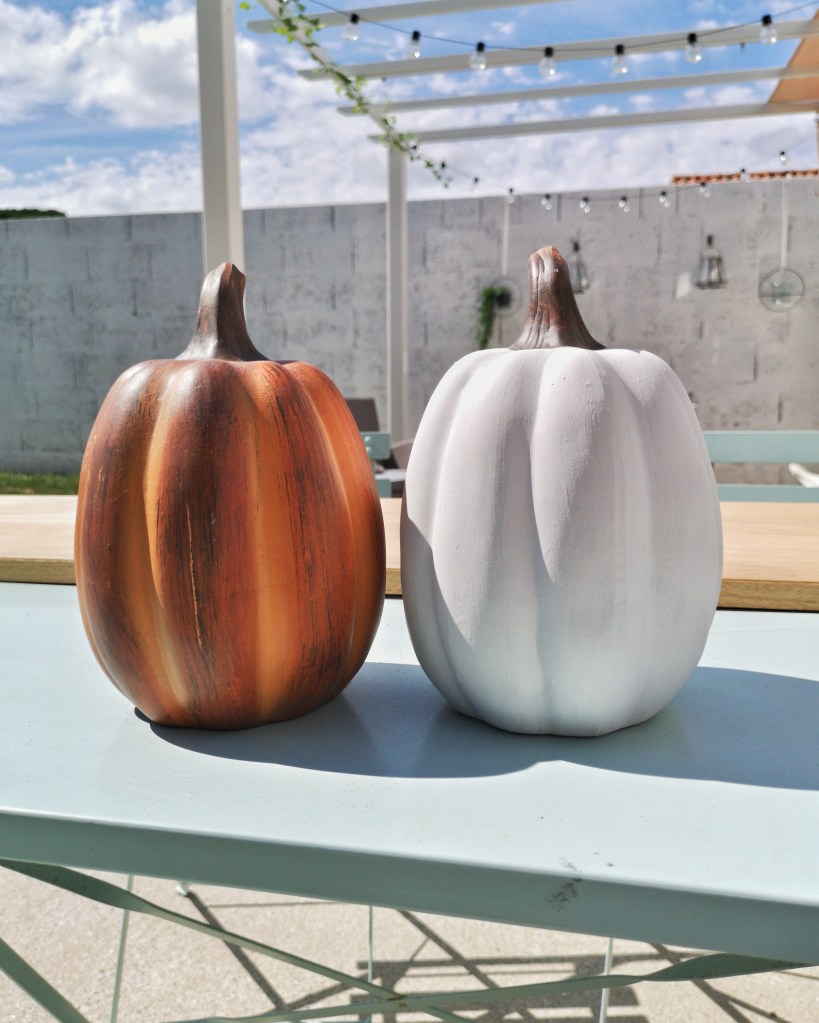 Les grandes citrouilles, je les ai relooké. Elles viennent de chez Action et elles étaient bien orange au moment de l’achat. J’ai appliqué dessus la peinture Chalky coloris gris nuage de chez Dulux Valentine disponible chez ManoMano pour qu’elles se différencient des courges blanches et cuivrées.