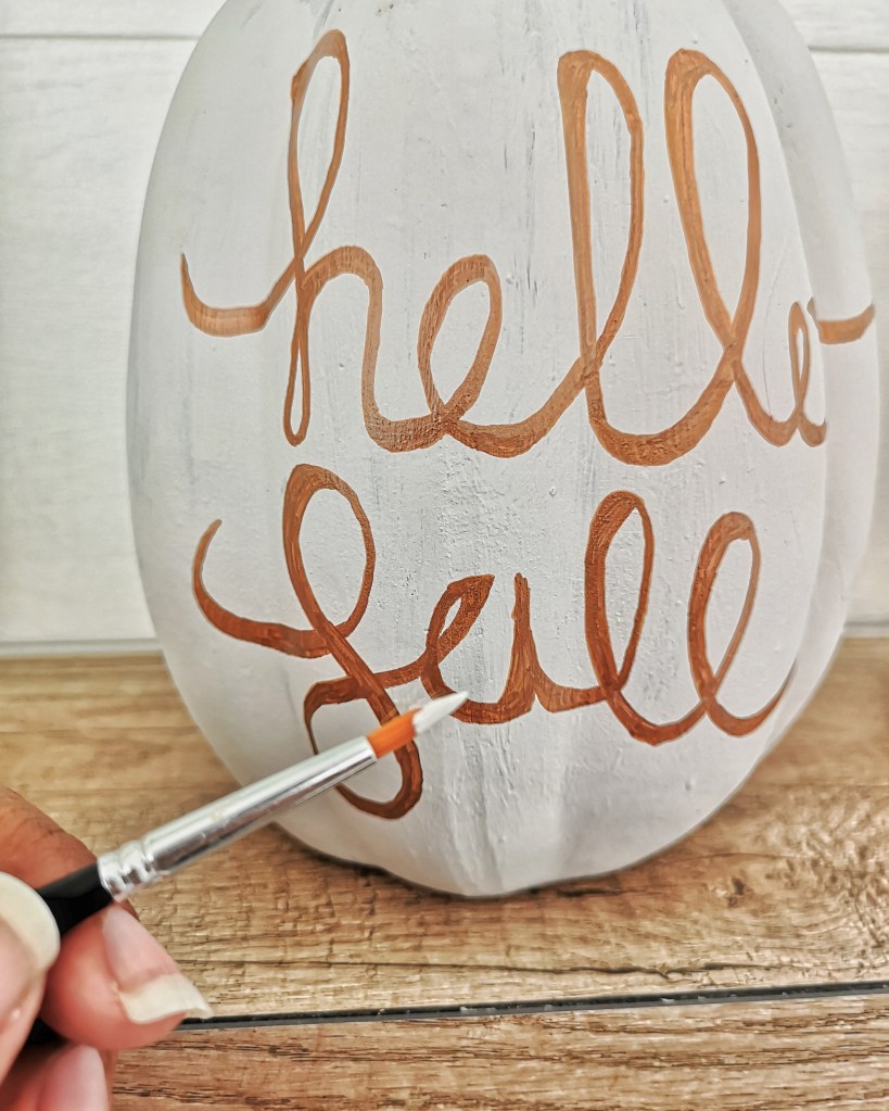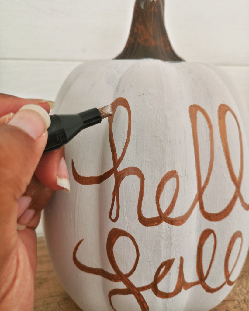 J’ai même tenté une petite calligraphie Hello fall sur l’une d’entre elle avec un stylo biseauté or moutarde de chez Action. Pas facile de tracer les lettres sur un support bossu, j’ai bien bavousé. J’ai rattrapé mes petits pâtés en les recouvrant avec de la peinture à l’aide d’un pinceau fin et pointu. Pour une première, je trouve le résultat pas trop mal.