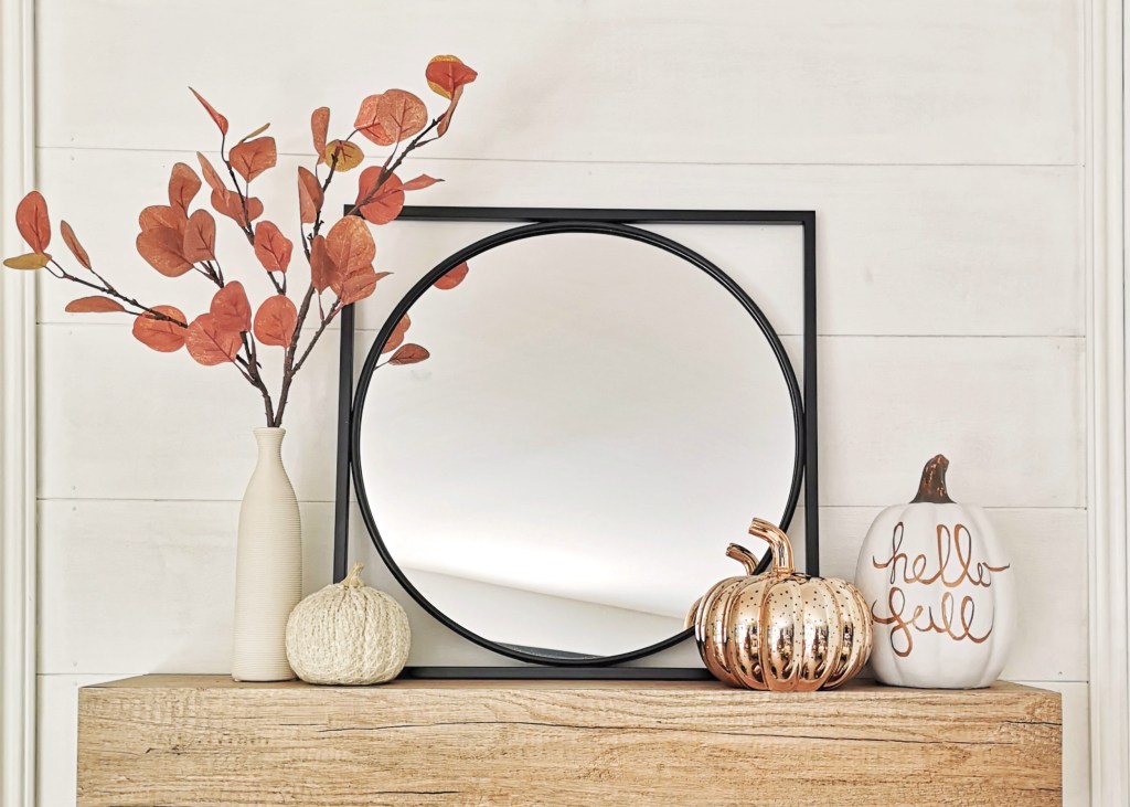 Autre élément indispensable, la végétation. Oui parce que l’automne, c’est aussi les changements de couleurs. Toujours dans le souci de ne pas tomber dans le trop orange, je me suis orientée vers une petite branche d’eucalyptus rouge dénichée sur Amazon pour remplacer la branche d’olivier estivale dans le vase sur la cheminée.