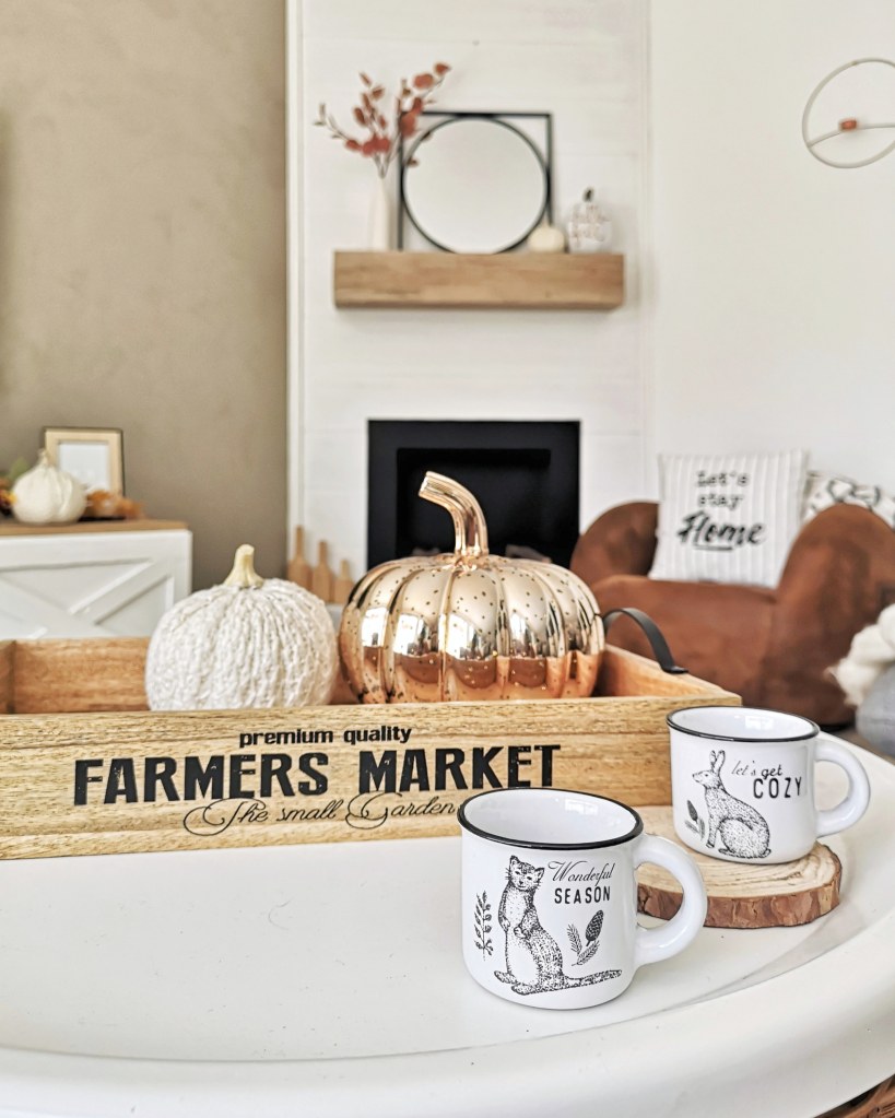 La pièce maîtresse de notre déco cette année, c’est définitivement cette sublime pancarte personnalisée Harvest Market que m’a envoyé Émeline, la créatrice de Baby Wood Designs. Réalisée à la main en Vendée, c’est définitivement le must-have pour une déco d’automne farmhouse réussie. Impossible de trouver ce genre de pancartes en France. On en trouve sur Etsy, mais souvent en provenance des USA avec des frais de port qui font frémir. Je suis absolument ravie de pouvoir exposer l’œuvre d’Émeline au pied de ma cheminée cet automne.