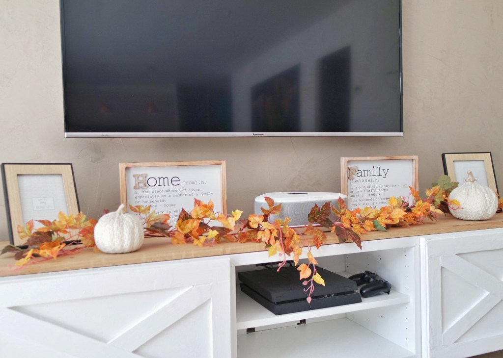 J’ai également installé des guirlandes tons ocres sur la table de la salle à manger et sur le meuble TV, dans le but de donner une touche végétale aux couleurs chaudes sans virer dans le orange « agressif ».