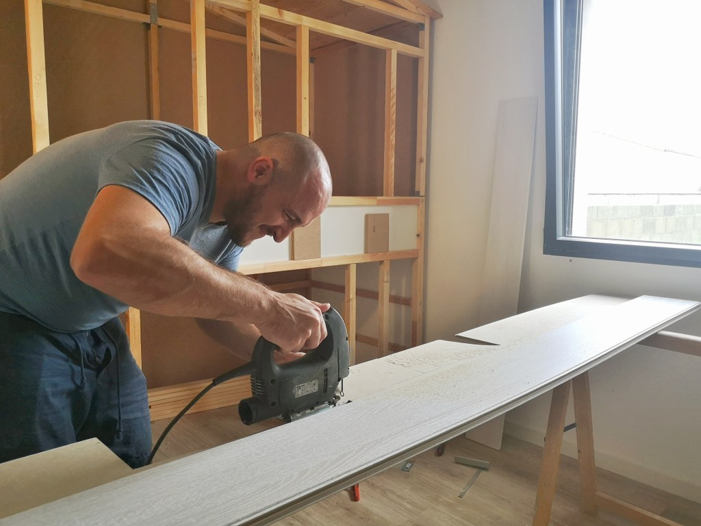 Pour le shiplap, quelques découpes on été nécessaires afin de dessiner les contours de la porte, des fenêtres et de l’entrée du garage.