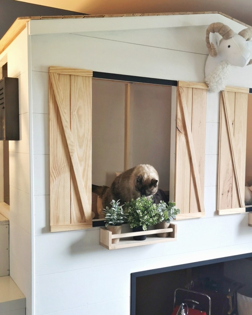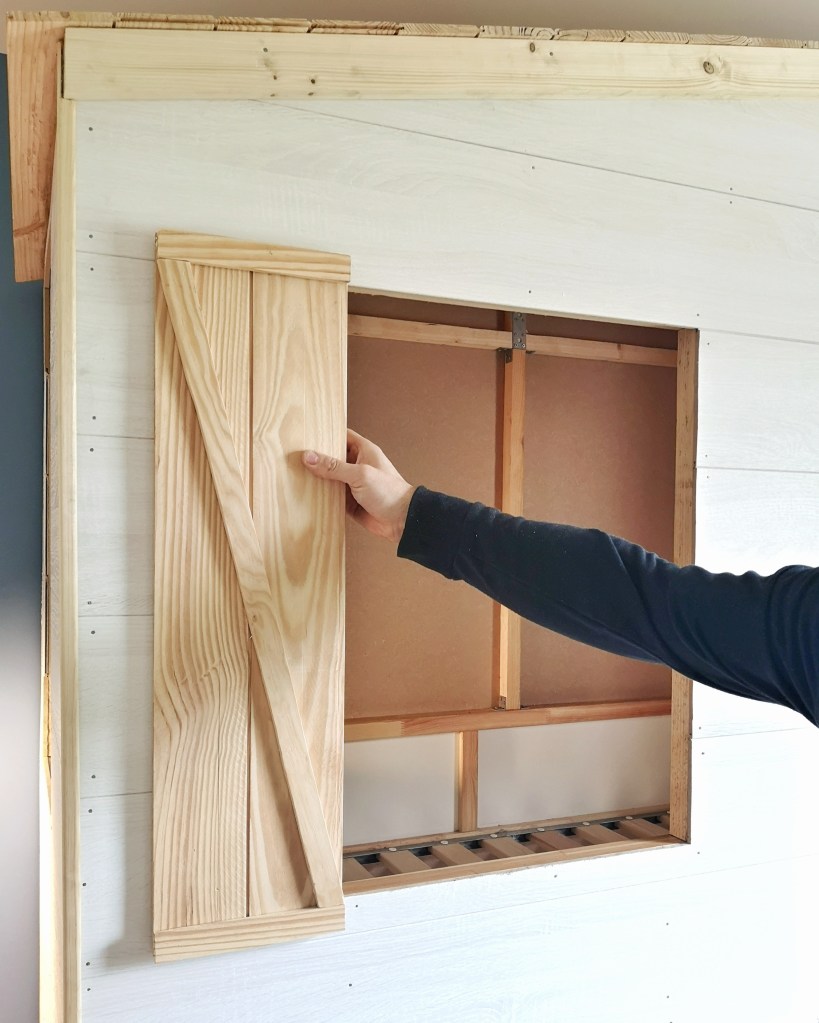 Puis dans de grandes planches de medium, nous avons découpé de quoi fermer la cabane à l’arrière et sur le côté droit. Les autres côtés seraient recouverts de lambris blanc type shiplap pour lui donner un style farmhouse. Nous avons ensuite créé le toit avec du lambris en bois naturel pour contraster avec le déclin blanc.