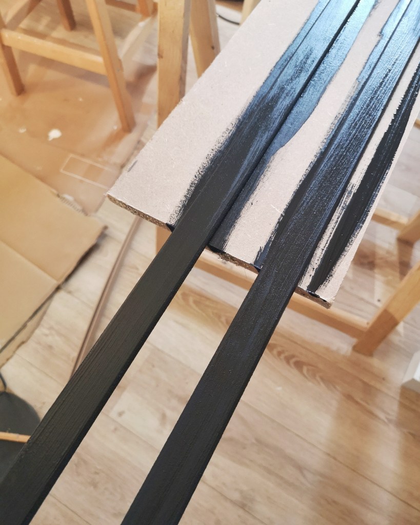 Pour les cadres des fenêtres et du garage, nous avons utilisés des champs plats que nous avons peint avec la peinture Charme noir ID Paris. Nous les avons collés tout autour des ouvertures.