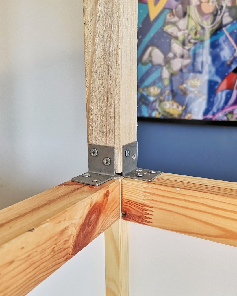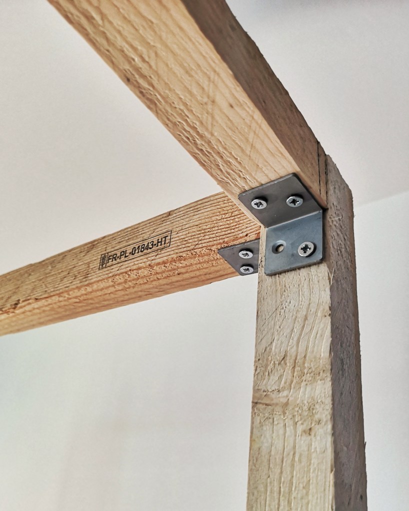 Dans un premier temps, MrLeg0 a raboté le dessus du lit afin d’y poser la structure de la cabane réalisée à partir de tasseaux, d’équerres et de pattes d’assemblage.