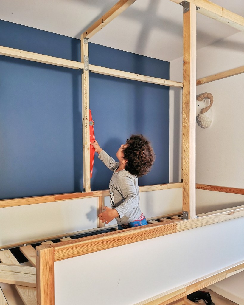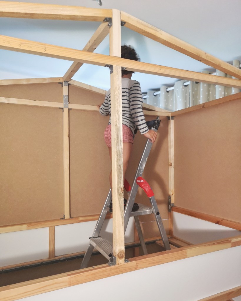 Nous avons longtemps cherché un lit pour MiniLeg0 qui corresponde à tous nos critères : un lit en hauteur, sous lequel on puisse jouer et ranger, en forme de cabane et bien évidemment, agréable à regarder. Nous n’avons jamais trouvé notre bonheur ou du moins, pas à un prix raisonnable – hello les lits à 5.000 $ ! Finalement, comme pour notre cheminée, la cuisine de MiniLeg0 ou encore notre meuble TV, on s’est dit « si tu ne le trouves pas, fais-le ».
