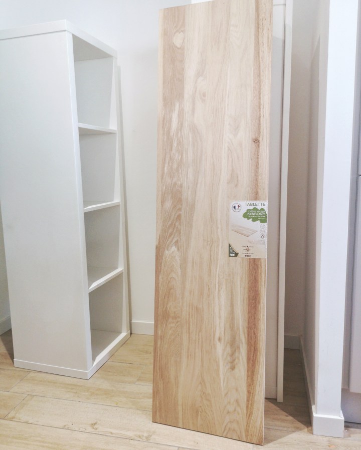 Pour le haut du banc, nous avons acheté une tablette en chêne massif que nous avons fait coupé sur-mesure chez Leroy Merlin.