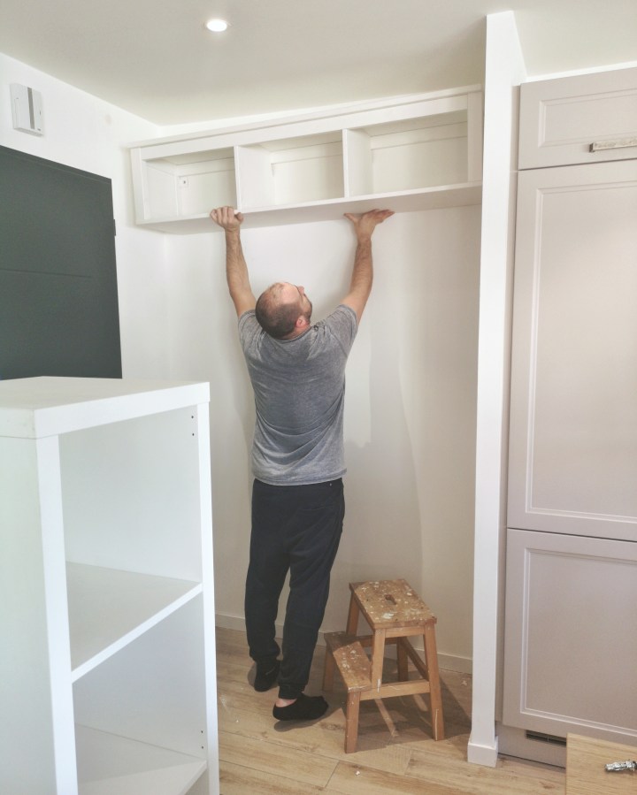Troisième essai, on vise les sommets. Je tiens l’étagère à bout de bras, sur la pointe des pieds, le plus haut possible au-dessus de ma tête, à peu près dans l’alignement des éléments hauts de la cuisine. Moi, 1m71, quelques années de BodyPump au compteur, ça peut servir quand on fait des travaux.