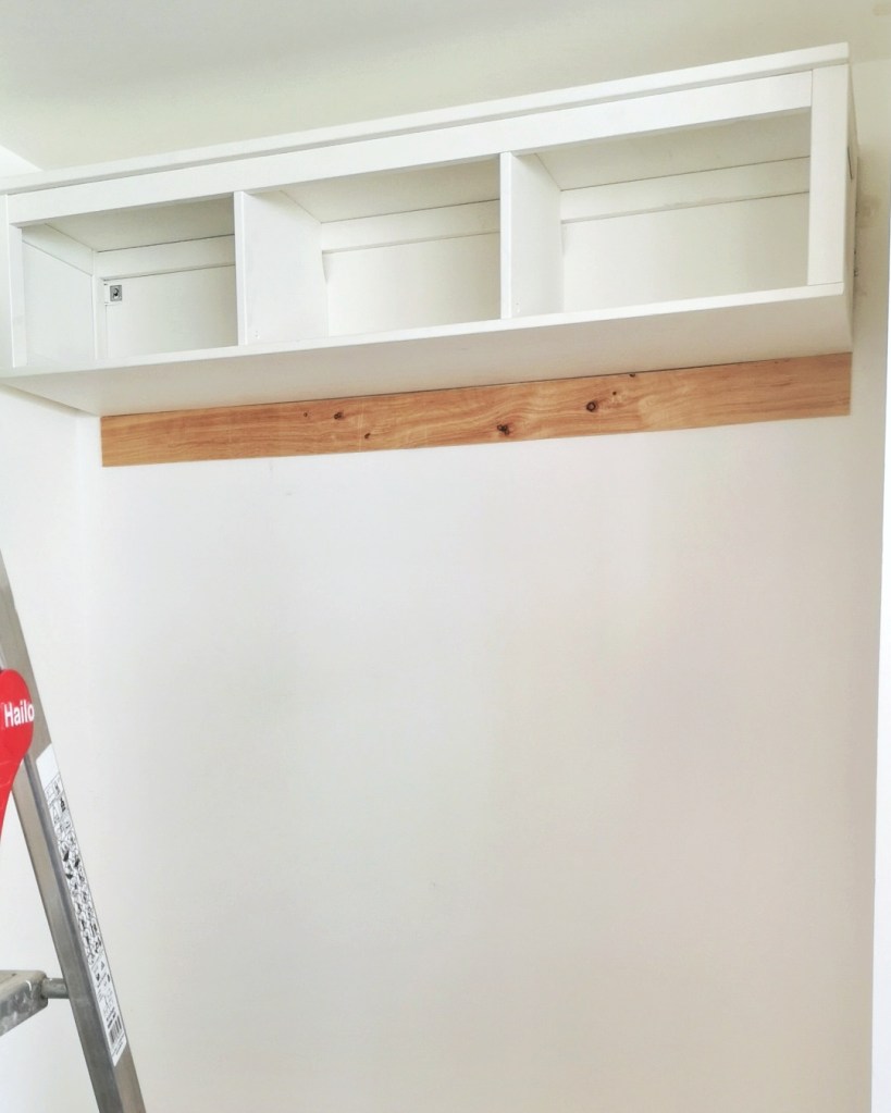 Premier morceau de la mudroom à poser : l’étagère Hemnes. Je peux vous dire qu’elle nous a donné du fil à retordre, mais pas que, elle a aussi tordu mon dos.