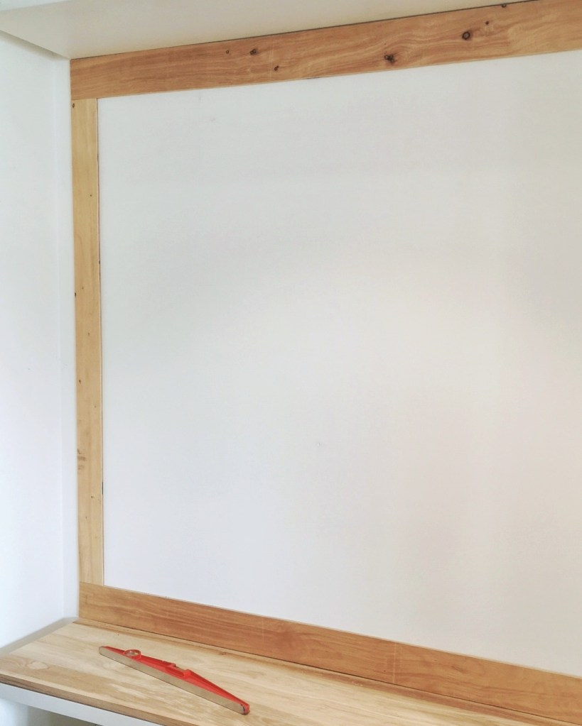 Nous avons découpé des tasseaux de 10cm de large, pour les moulures horizontales et les plinthes du banc. Puis on a découpé des tasseaux de 8cm de large pour les moulures verticales. Nous les avons collé directement sur le placo avec de la colle tous supports.