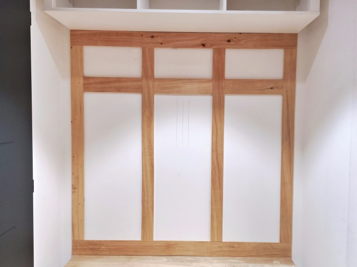 On a ensuite ajouté des sections : 2 moulures supplémentaires à la verticale pour créer 3 « penderies » distinctes et 1 moulure supplémentaire à l’horizontale pour venir y poser les patères.
