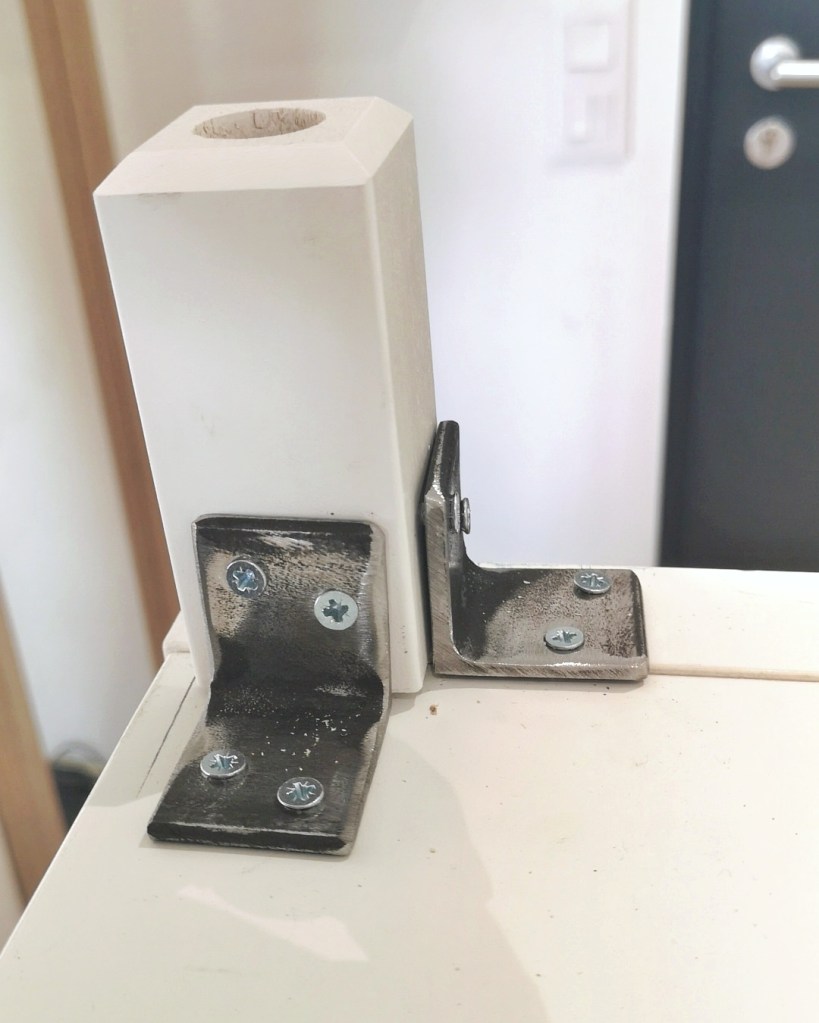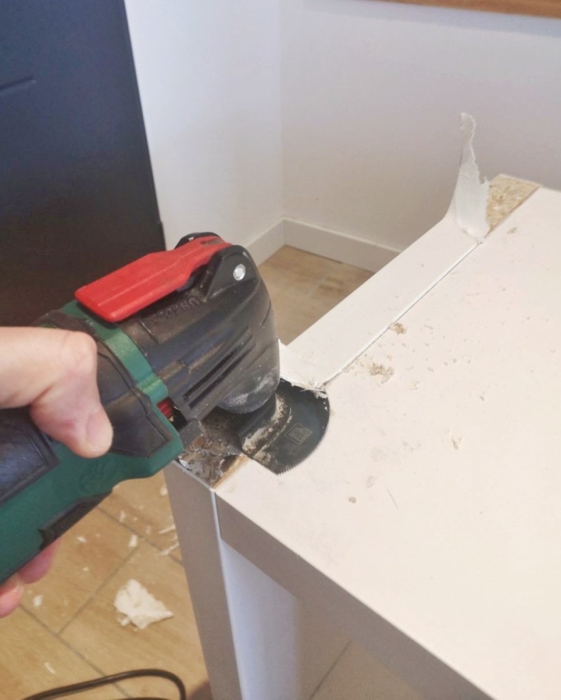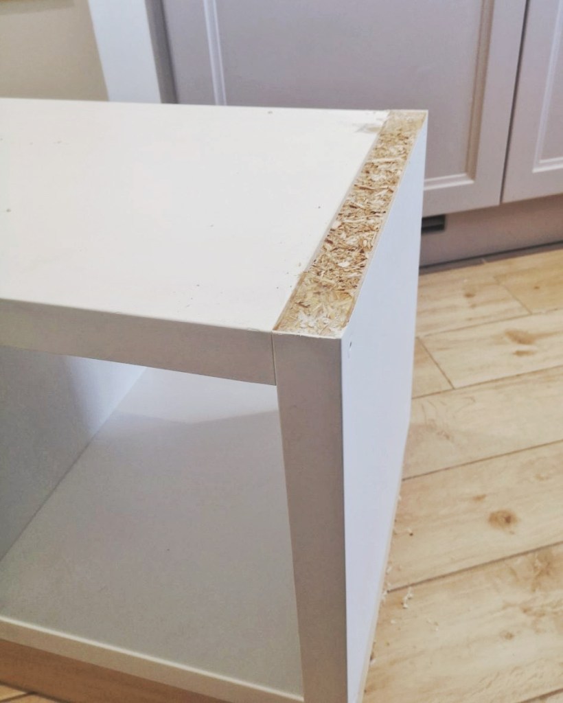 Afin que la tablette soit bien à plat sur le meuble Kallax, nous avons dû retirer les coins qui dépassaient.