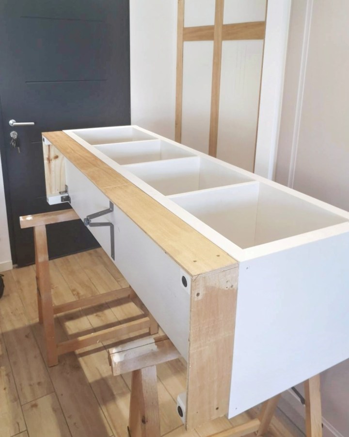 J’ai trouvé une étagère Kallax 4 cases sur Le Bon Coin pour 15 €. En lui ajoutant des pieds, une plinthe pour les camoufler et un plateau bois, il aurait l’air aussi smart que le meuble TV Hemnes. Le gros des éléments en poche, il n’y avait plus qu’à se retrousser les manches !