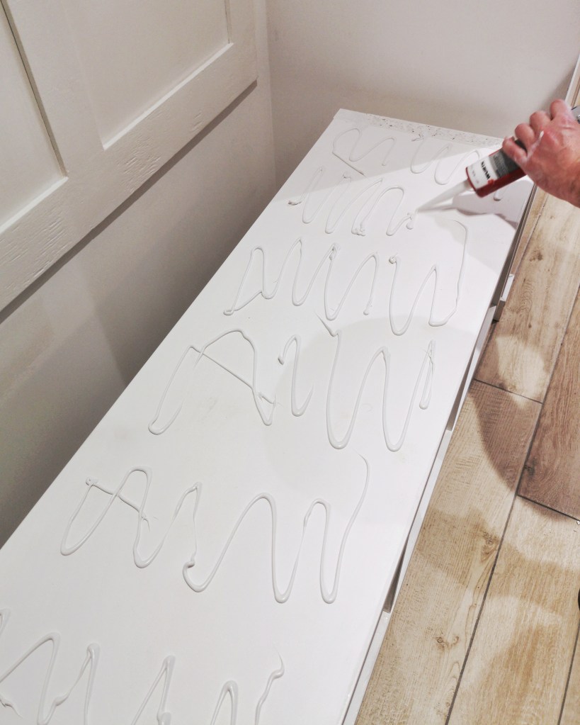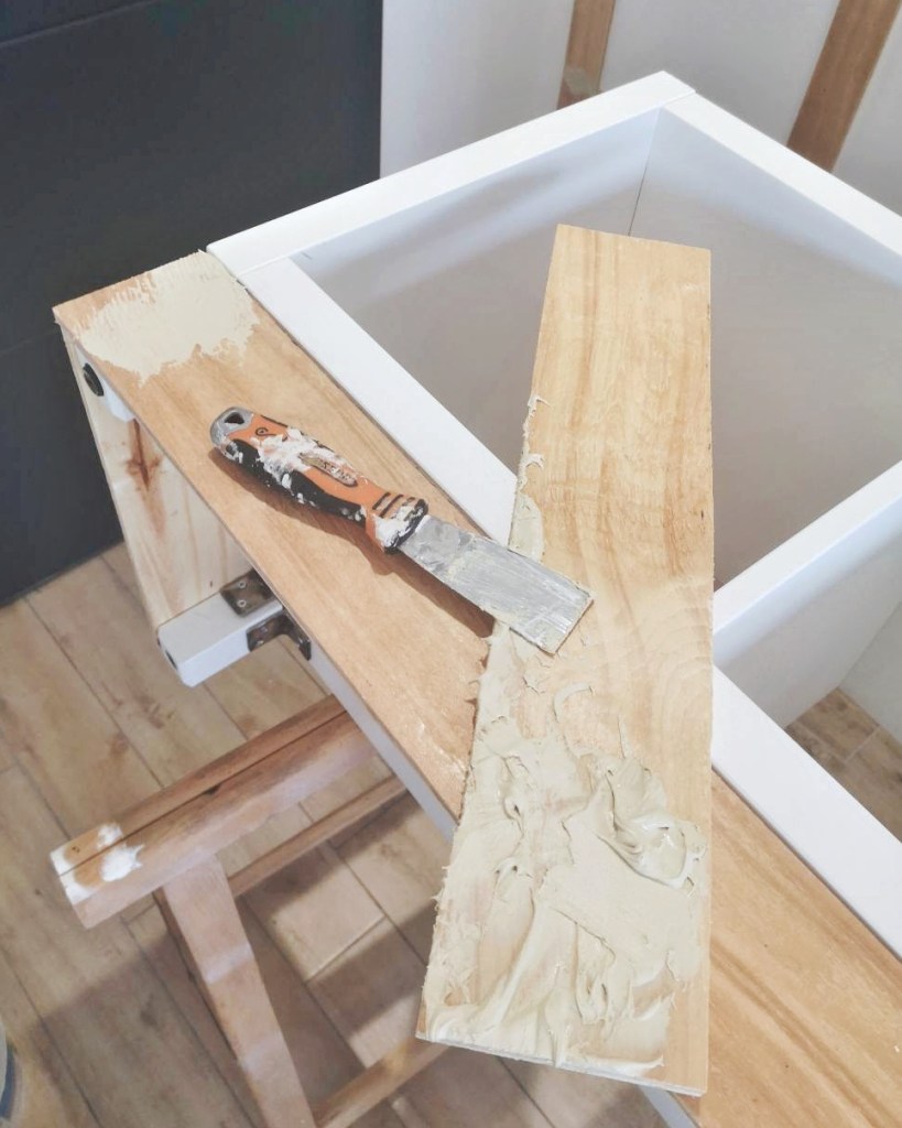 Nous sommes ensuite venus coller la tablette directement sur le meuble. Après un léger ponçage, nous avons appliqué le vernis ultra-résistant de V33.