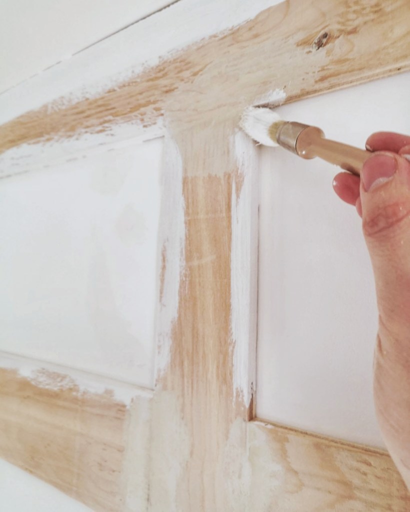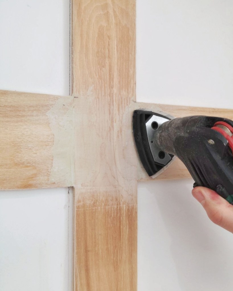 Les moulures et les plinthes n’allaient bien évidemment pas rester en bois brut. Avant de les repeindre, nous avons fait des joints pour camoufler les vis et les rainures. L’idéal aurait été d’utiliser de la pâte à bois mais nous n’en avions pas, nous avons donc fait les joints avec du mastic tous support (ça pue, mais ça fonctionne). Ensuite nous avons poncé les joints pour un résultat bien lisse et invisible.