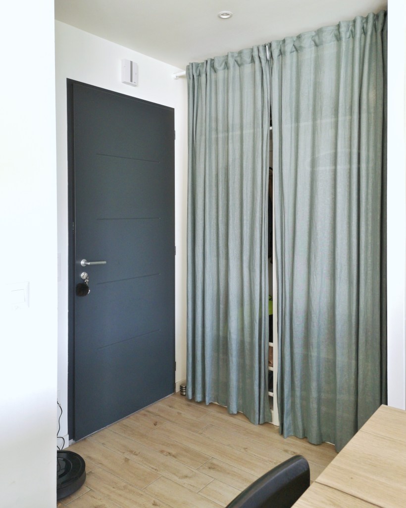 Ouais sauf qu’au lieu de penser à de jolis rideaux clairs en lin par exemple, je suis allée dénicher un espèce de voile vert de gris qui n’avait rien d’accueillant ni de chaleureux. Au contraire, comme les rideaux était placés près de la porte grise anthracite, on s’est retrouvé avec un gros bloc froid et sombre en guise d’entrée #Fail