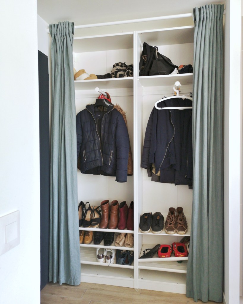 Comme je fais une allergie aux portes de placards (oui je sais j’ai un vrai problème), je me suis dit que de jolis rideaux « habilleraient » plus joliment l’entrée et la rendraient plus « accueillante et chaleureuse »…