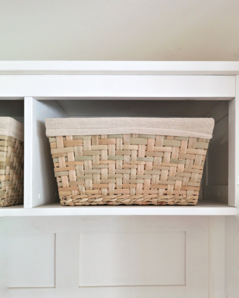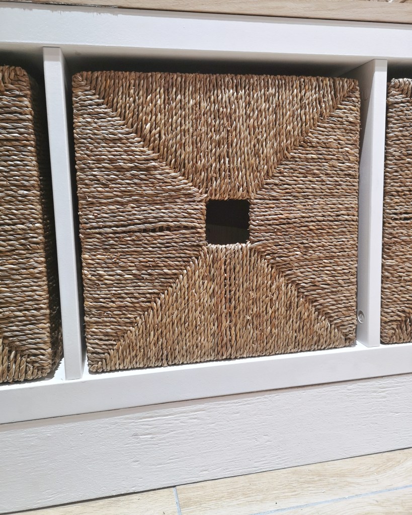 Pour les paniers de l’étagère Hemnès, j’ai choisi des paniers Compactor en jonc de mer tressés à la main. Nous y rangeront les sacs, les bonnets, les gants, et autres accessoires. Pour le rangement des chaussures dans le banc, je suis partie sur le modèle Knispa de chez Ikea, également en jonc de mer et suffisamment grand pour y loger plusieurs paires de chaussures chacun.