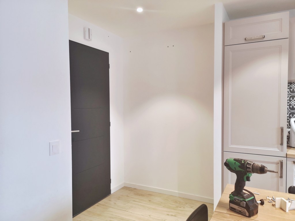 On garde le dressing , il ira dans notre bureau, pièce dans laquelle jusque-là nous n’avions pas de rangement aménagé. On y installera des étagères plates pour remplacer les étagères à chaussures. Et voilà, l’entrée est en mode page blanche, prête à recevoir la future mudroom.