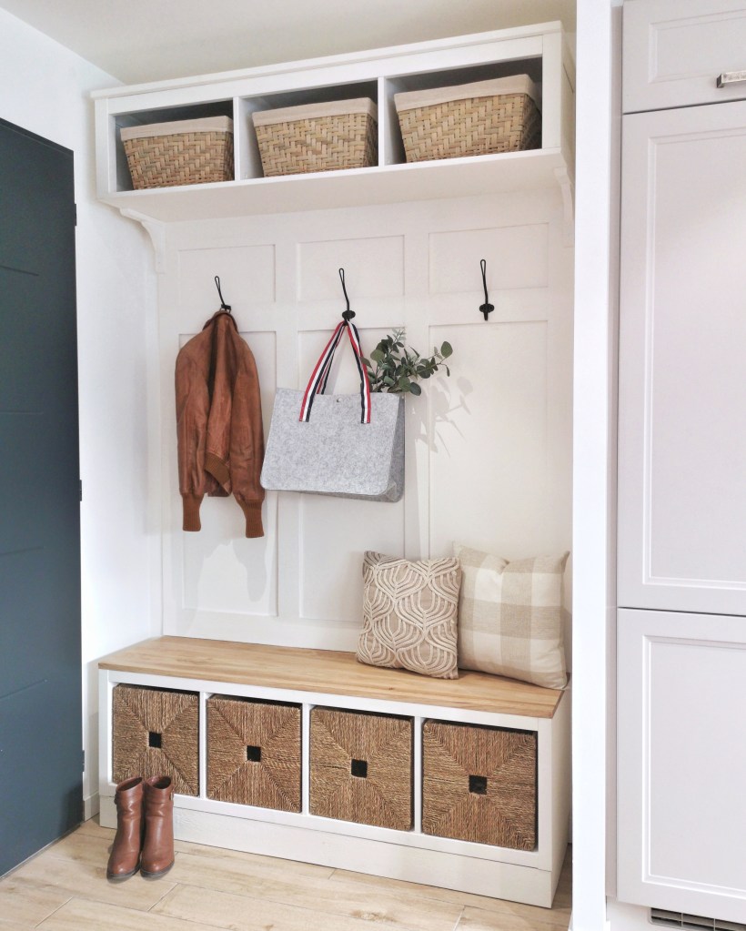 Une mudroom en gros c’est un vestiaire. Aux Etats-Unis c’est même parfois toute une pièce dédiée mais bon, c’est pas Hollywood ici ! Communément elle est divisée en 3 parties : l’élément haut pour les accessoires et les sacs, les portes-manteaux au milieu et un banc sur lequel on peut s’asseoir pour mettre, retirer et ranger ses chaussures.