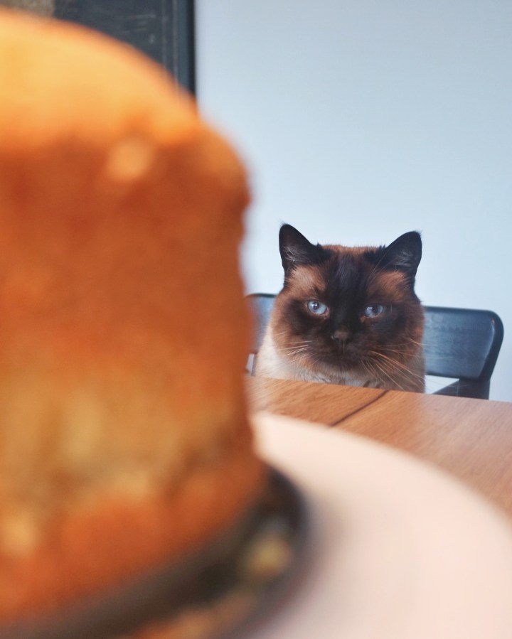 Garnissez le moule à manqué préalablement beurré avec la préparation et enfournez 30 minutes à 120C° puis 30 minutes à 150C° (pour ma part j’ai dû ajouter 5 minutes de cuisson car le gâteau n’était pas assez cuit). Démoulez le gâteau et laissez-le refroidir (de préférence loin du chat).