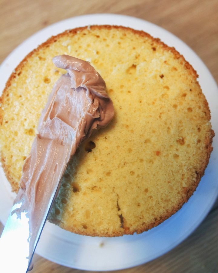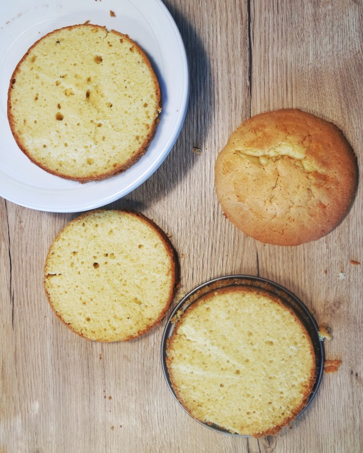 Une fois que le gâteau a refroidi, découpez le sommet, puis le reste en 3 tranches à peu près égales (le sommet vous pouvez le manger, il ne vous servira pas).