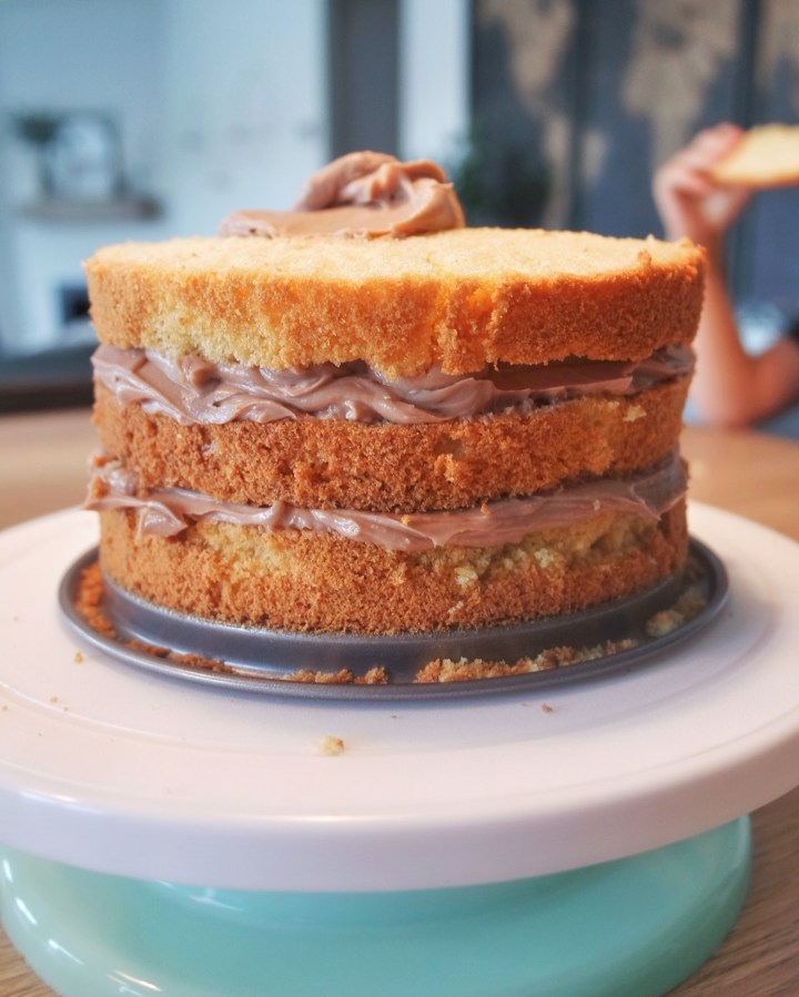 Ensuite venez tartiner la ganache à chaque étage de votre gâteau, puis tout autour avec une spatule plate. J’ai utilisé un plateau tournant afin d’avoir un rendu à peu près lisse et propre. Mais ne vous prenez pas trop la tête parce que le nude cake n’est pas censé être entièrement recouvert, c’est bien pour ça qu’il s’appelle nude (en français nu), sinon il s’appellerait « sapé » ou sur « son 31 ». Et voilà ! On le met au frigo jusqu’au service.