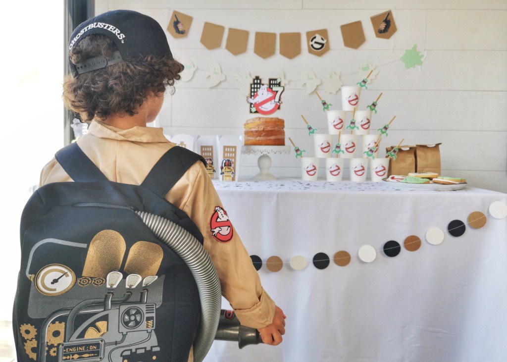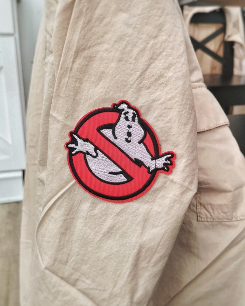 Ah, ces fameux costumes ! Il nous en ont donné du fil à retordre (rendez-vous sur notre chaine YouTube pour suivre nos mésaventures). Mais finalement on a réussi à faire quelques choses de sympa visuellement. Pour les déguisements adultes, nous avons simplement acheté des chemises beiges sur lesquelles nous avons collé des écussons Ghostbusters trouvés sur Amazon.
