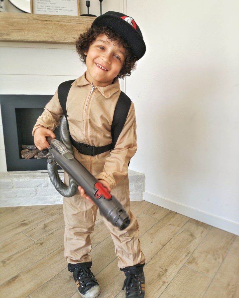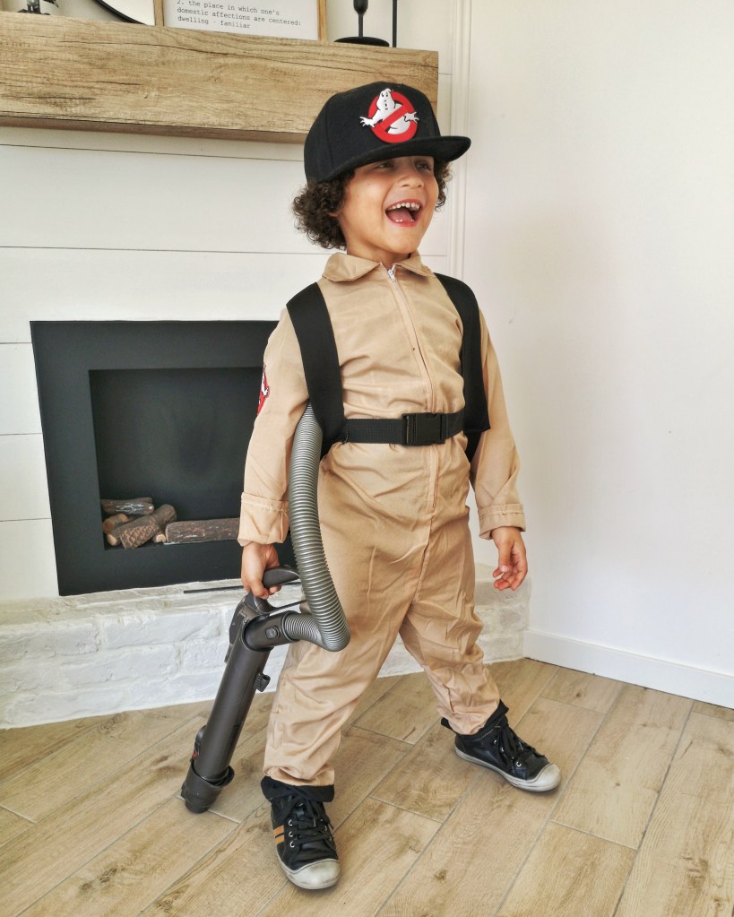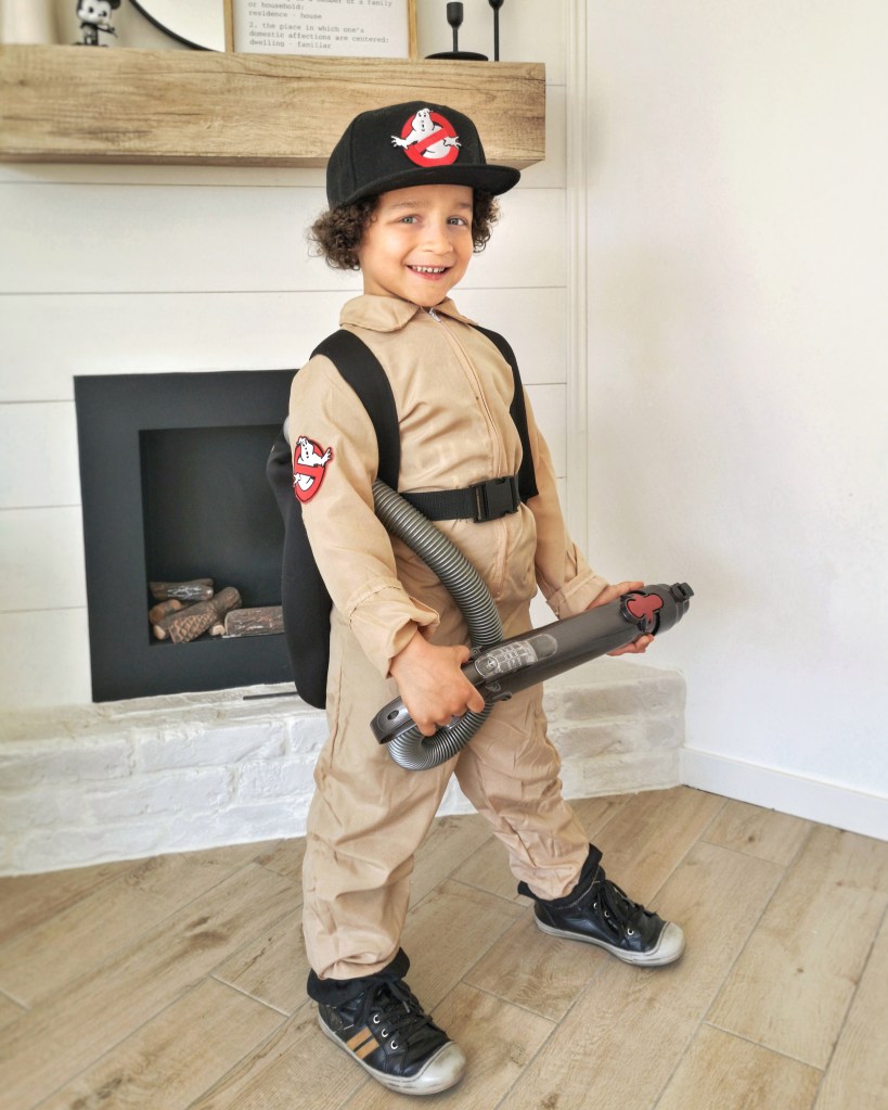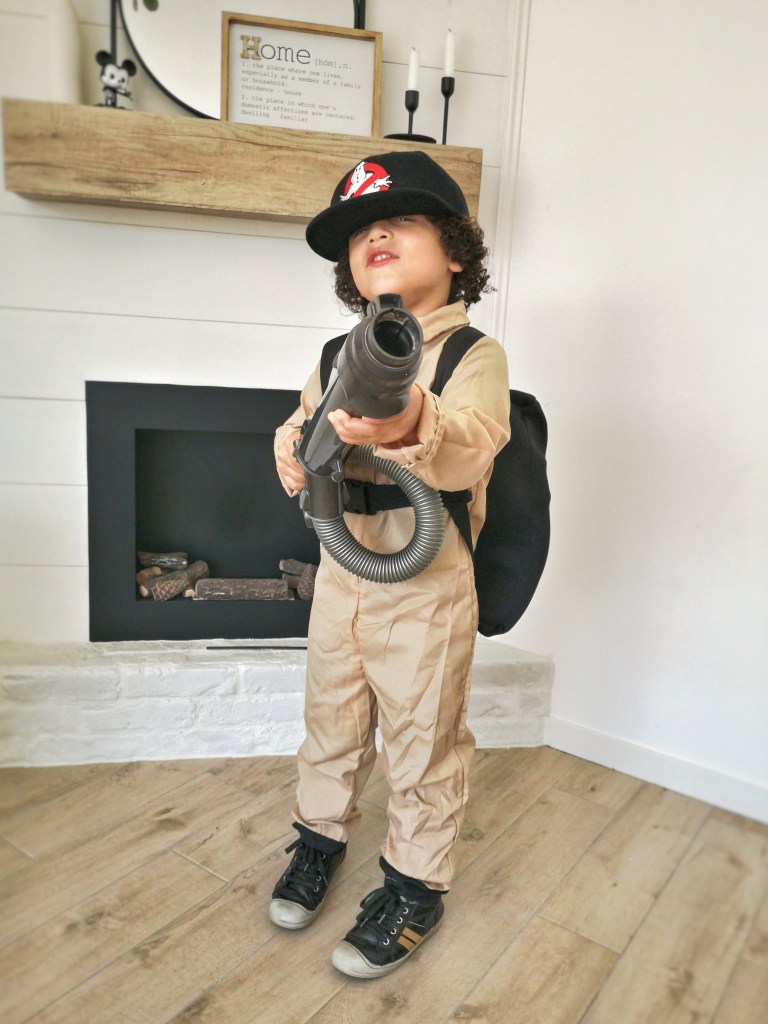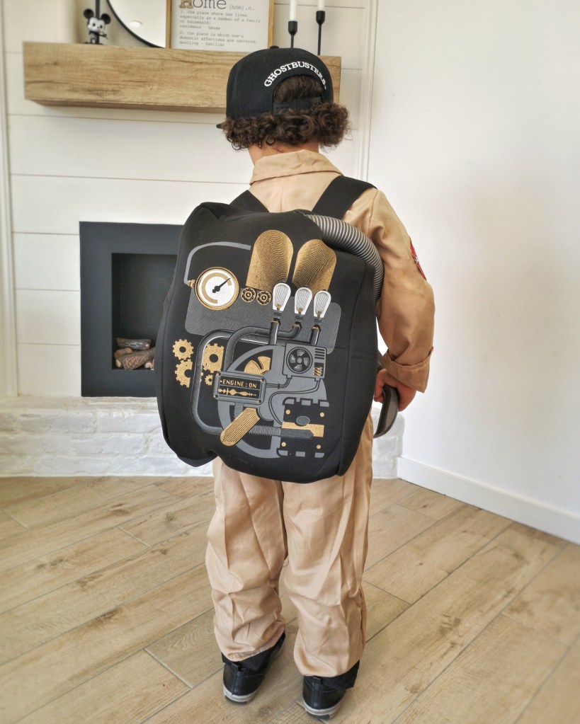 Pour le costume de MiniLeg0, nous sommes passés par le site deguisetoi.fr. Ce n’est pas un costume sous licence donc l’écusson SOS Fantômes n’était pas inclus, c’est nous qui l’avons ajouté, comme pour nos costumes adultes. Le kit incluait un sac à dos pour représenter le proton pack. Par contre, la photo du site était un peu trompeuse (ou on a mal lu la description, c’est possible aussi) mais le pistolet laser n’était pas inclus. Pas de problème, que des solutions. Notre vieil aspirateur Dyson s’est fait désossé et on a tout simplement glissé le tuyau dans le sac à dos. L’embout faisait parfaitement illusion pour le laser et MiniLeg0 était enchanté avec sa casquette Auchan vissée sur la tête.