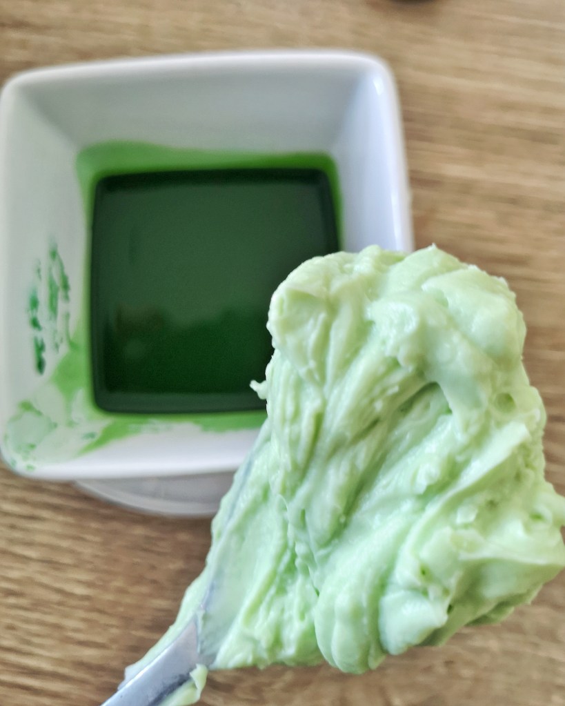 Nous avons également réalisé des cupcakes dont la base muffin a été réalisée avec la même génoise que le nude cake. Pour la ganache, même recette également, mais nous avons remplacé le Nutella par de l’extrait de vanille (versez dans la préparation et goûtez au fur et à mesure pour trouver le bon dosage). Et pour lui donner un air de « slime », nous avons mélangé des colorants alimentaires bleu et et jaune pour obtenir du vert. Le mélange paraît foncé, mais lorsqu’il est mélangé au mascarpone, il s’éclaircit pour donner un joli vert mint.