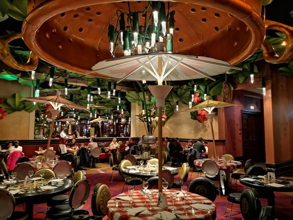 Côté restaurants, c’était du grand n’importe quoi. On a beaucoup (trop) mangé à l’Hypérion faute de s’être suffisamment renseignés avant de partir. Nous avions aussi mangé au Planet Hollywood (entre autres parce qu’ils prenaient les tickets restaurant) et apparemment, vu la tête de MrLeg0, les portions étaient énormes.