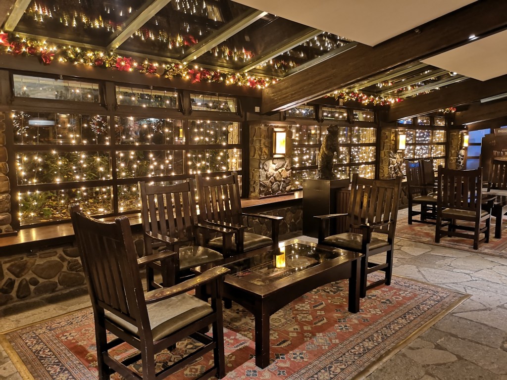 Cette fois-ci, nous avions logé au Sequoia Lodge. Une grande première pour nous tous. Outre le fait que son look rondins de bois soit absolument parfait pour la période de Noël, nous avons vraiment apprécié la décoration, les restaurants, la partie lounge près de la cheminée et la chambre. Les petits moins : l’eau de la piscine était très froide, l’insonorisation des chambres n’est pas top. Mais sinon, c’était un super séjour.